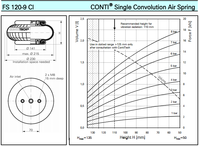 橡膠氣囊工作時,內(nèi)腔充入壓縮空氣,形成一個壓縮空氣氣柱。隨著振動載荷量的增加,彈簧的高度降低,內(nèi)腔容積減小,彈簧的剛度增加,內(nèi)腔空氣柱的有效承載面積加大,此時彈簧的承載能力增加。當振動載荷量減小時,彈簧的高度升高,內(nèi)腔容積增大,彈簧的剛度減小,內(nèi)腔空氣柱的有效承載面積減小,此時彈簧的承載能力減小。這樣,空氣彈簧在有效的行程內(nèi),空氣彈簧的高度、內(nèi)腔容積、承載能力隨著振動載荷的遞增與減小發(fā)生了平穩(wěn)的柔性傳遞、振幅與震動載荷的高效控制。還可以用增、減充氣量的方法,調(diào)整彈簧的剛度和承載力的大小,還可以附設輔助氣室,實現(xiàn)自控調(diào)節(jié)。